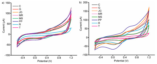 Voltammetric responses of C-LuPc2-Tyr enzymatic electrode in (a) skins extracts (b) seeds extracts of different grape varieties: Cabernet (C), Garnacha (G), Juan García (J), Mencia Regadio (MR), Mencia Secano (MS), Prieto Picudo (P), Rufete (R) and Tempranillo (T).