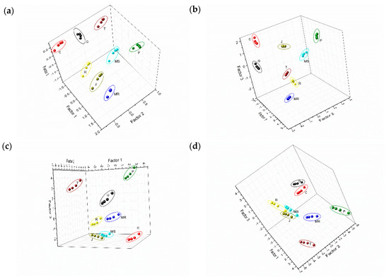 After performing PLS regression using the FC index as response variable, the scores of the three most representative factors for grape skin extracts wavelet CV data are presented in the Figure 5a. It showed well-defined and separated clusters for each grape variety superimposed on a linear surface, showing that all extracts analyzed could be clearly discriminated. In addition, Prieto Picudo (P) skin samples with higher polyphenol index were located in the upper part of the 3D plot toward the right, while the ones with the lowest values are at the bottom of the diagram. It confirms that the levels of phenolic compound play an important role in the discrimination capabilities of the e-tongue. Similar results were obtained from the PLS regression using the FC index as response variable and grape seed extracts wavelet CV data (Figure 5c). As can be observed, the eight seeds extracts are clearly separated and also superimposed on a linear surface showing that the procedure is correct. Clusters were distributed in the plot according to the polyphenolic content (Table 1). Thus, Tempranillo (T) grape seeds (with the lowest values of Folin and TPI) and Prieto Picudo (P) were clearly separated (left and right respectively) from the rest of the extracts. Comparable results can be obtained when applying PLS regression using TPC index as response variable (Figure 5b,d for grape skin and seed extracts wavelet CV data, respectively).