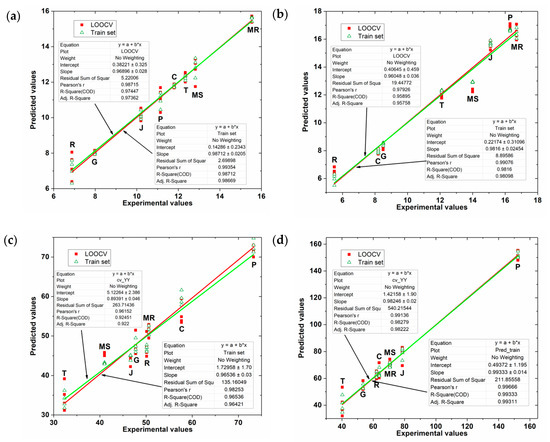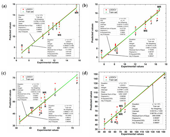 To assess the quality of the regression PLS model obtained, the FC and TPC indexes predicted by the model using the e-tongue data was correlated with those obtained using the spectrophotometric reference methods (experimental FC and TPC indexes). Figure 6 shows this representation for all the PLS models obtained.