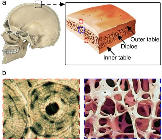 Skull bone structure. (a) Structural component of human skull bone, each layer magnified in (bi) the outer tables and (bii) diploe.