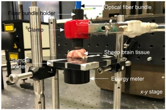 We embedded an imaging target in a brain tissue-like mimicking phantom with optical properties similar to those of the brain tissue. To determine the light attenuating characteristics of the brain tissue, slices of sheep brain with a thicknesses between 0.5 and 1.75 cm were prepared. The experimental setup is shown in Figure 2. The ex vivo brain tissue was held on a metal plate with a circular hole. An energy meter (QE8SP-B-BL-INT-D0, Gentec-EO Inc., Quebec City, QC, Canada) was coaxially aligned to the optical fiber bundle through the hole; the surface of the sensor was protected with an optically transparent thin film. The brain tissue-mimicking phantom was realized by mixing gelatin (to represent the acoustic properties) and sugar-free psyllium hydrophilic mucilloid fiber (Metamucil, P&G, Cincinnati, OH, USA) (to represent the tissue optical attenuation and echogenicity). First, 8% gelatin was dissolved in water, followed by 4% fiber in a transparent one-side-open cubic acrylic box (Lanscoery, Monterey Park, CA, USA) [68]. Tissue-mimicking phantoms with thicknesses of 1, 2, 3, 4, and 5 cm were prepared.