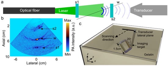 Experimental setup to find the optimum distance between the transducer and skull piece 2, and between the optical fiber and skull piece 1. (a) Schematic of the experimental setup, (b) photoacoustic (PA) image of the wire phantom in water with the optimum position of the transducer and optical fiber, and (c) a 3D model of the square loop imaging target in gelatin. Imaging target is slanted at 20° from the z axis. Scanning direction is along the x axis. Transducer lateral plane is along the y axis. s1: skull piece 1; s2: skull piece 2; w: polyactic wire. The distance between the transducer and s2 is <1.5 cm, the distance between the transducer and the imaging target is <3 cm, and the distance between the optical fiber bundle and s1 is 0.5 cm.