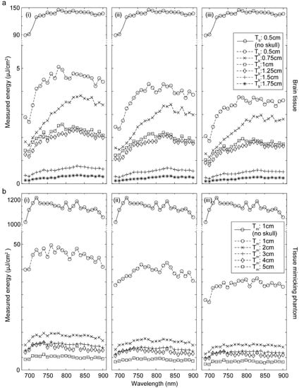 Optical energy measured with different thicknesses of (a) sheep brain tissue and (b) the brain tissue-mimicking phantom (gelatin + fiber) with a skull bone to block the illumination path with a thickness of (i) 0.7, (ii) 1.0, or (iii) 1.3 mm. Optical fiber bundle was placed on top of the brain tissue or the brain-like tissue-mimicking phantom. Tb: brain tissue thickness; Tm: tissue-mimicking phantom thickness.