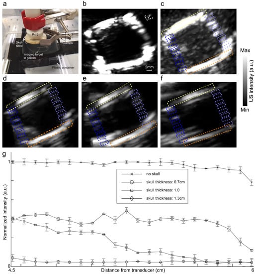 We then evaluated the ultrasound images of the square loop phantom when the transducer was held 1.5 and 3 cm away from the skull piece and the square loop phantom, respectively; when the optical fiber was placed 0.5 cm away from the skull piece (see Figure 3); and when the orientation of the phantom was at an angle of 20° (Figure 4c) to the viewing plane of the probe. We imaged the target in both gelatin (see Figure 6b) and gelatin with fiber mixture (see Figure 6c). The US images without the skull clearly present the morphology of the square loop. In Figure 6d–f, a skull piece with thicknesses of 0.7, 1.0, or 1.3 mm were used when the square loop target was in gelatin with the fiber mixture. The ROIs on the squared loop phantom image were chosen to evaluate the effect of the skull aberration. The attenuating and aberrating effects of the skull are shown in Figure 6g. A summary of the quantitative evaluation is provided in Table 1.