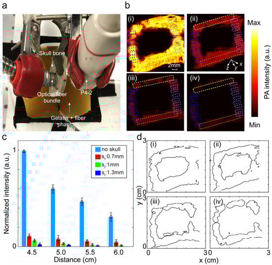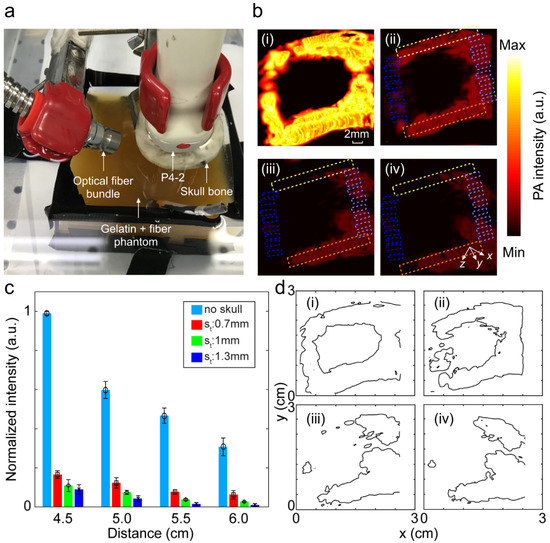 Finally, we studied the distorting effects of the skull on the PA images when it blocked both the acoustic propagation and the light illumination paths. The experimental setup as well as the PA images of the square loop imaging target with different thicknesses of the skull are shown in Figure 9a,b, respectively, and the summary of the quantitative evaluation is provided in Table 4.