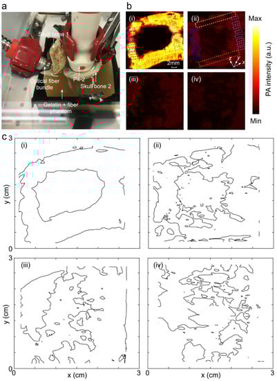 The findings of this experiment were as follows: (i) The light was completely diffused inside the tissue-mimicking phantom after passing through the skull pieces, therefore a homogenous illumination of the target phantom was obtained. (ii) The horizontal sides of the phantom generated a higher PA signal amplitude compared to the vertical sides because of the transducer viewing plane. (iii) The only skull tissue that allowed seeing the structure of the imaging target accurately was the skull piece with a 0.7 mm thickness; with the 1.0 mm skull, the shape of the imaging target was almost visible (Figure 9c(iii)), and with the 1.3 mm skull (Figure 9c(iv)), the structure of the square loop target in the image was totally distorted and attenuated to such an extent that the target was not comprehensible.