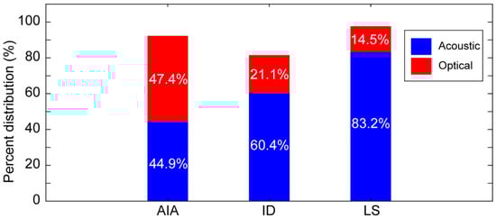 Percent distribution of the evaluating parameters from the acoustic and optical paths when both paths are blocked by the skull (thickness: 0.7 mm). AIA: average intensity attenuation; ID: image distortion; LS: lack of smoothness (1-S).