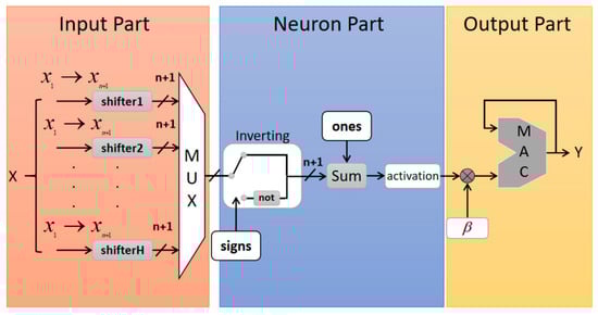 where and are random quantities (in the program, can take the following values: 1, 2, 3). If is extended to and to , the bias term can be embedded in . The second part, Neuron Part, receives the results of the parallel processing from the first part and calculates the output of the activation function. The third part, Output Part, receives the output of the second part and calculates the output neurons through serial processing. A finite-state machine controls the entire process, ensuring that the calculations of the third part are always one clock cycle ahead from the calculations of the first and second parts.