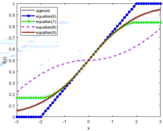 As shown in Figure 2, comparing with the sigmoid function, Equation (9) almost perfectly presents the sigmoid function.