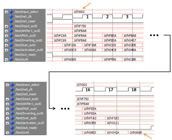 Figure 3 shows the functional simulation results of the input and output signals of the modules in the FPGA architecture, including: clock signal (net_clk), reset signal (net_reset), pattern selection signal (input_select), an output signal of the Input module (Input_out0—an eigenvalue), an output of the Shifter module (Shifter1_out0), an output of the Mux module (Mux_out0), an output of the Inverting module (Inverting_out0), an output of the Sum module (Sum_out0), an output of the activation module (activation_out0), output enable signal (out0_ready) of the Mac module which indicates that the result has been calculated and the final output of the system (out0) in the Mac module. Taking the signal in Figure 3 as an example, it represents the calculation process of the data of one pattern in the FPGA, where the value “10′h002” of the Signal input_select represents the calculation of the second pattern currently being performed. The calculation process in the FPGA given in Figure 3 has 18 clock cycles of the Signal net_clk, corresponding to the 18 hidden nodes in the SCN model. The Signal out_ready in the figure is the flag signal for calculating the data of each pattern. The Signal out_ready is set low at the rising edge of the Signal net_reset, indicating that this pattern data calculation process starts, and the low level state is always maintained during the calculation process. Then after the calculation is completed (that is to say, after the 18 clock cycles of the Signal net_clk), the Signal out_ready is set high, which indicates that the pattern data calculation process ends. After the rising edge of the Signal out_ready appears, the value “16’h066B” of the Signal out0 is the prediction result of the second pattern. The specific implementation process of the SCN on the FPGA is as follows: After being triggered by the reset signal (net_reset), the Shifter module acquires an input vector from the Input module. At the rising edge of the next clock, the Mux module receives the result from the Shifter module in parallel. The Inverting module processes the data and outputs it according to the signs of the input weights. After another rising edge of the clock, the Sum module adds up the data and activates the data through the activation module. The Mac module accumulates the activated data after another rising edge of the clock. When all data accumulation is completed, the Signal out0_ready generates a rising edge, and then the final output of the system can be read out from the signal out0.