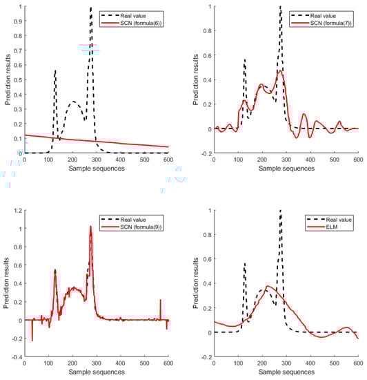 Figure 4 and Figure 5 show the results of FPGA regression prediction model on the simulation data set and real data set. In the simulation data set, the number of hidden layer nodes of the SCN and ELM were 18 and 35 respectively, while in the real data set, the number of hidden layer nodes of the SCN and the ELM were 42 and 55 respectively. As can be seen from Figure 4, for the simulation data set, the SCN model based on Equation (7) and the ELM model can only predict the general trend of the real value, while the SCN model based on Equation (6) cannot predict the trend of the real value, and only the SCN model based on Equation (9) can predict the real value well. As can also be seen from Figure 5, for the real data set, the SCN model based on Equation (9) has the best prediction result, and the predicted value almost completely coincides with the real value, while the prediction result of other models is relatively poor. Therefore, both the simulation data set and real data set prove that the FPGA implementation of the SCN model based on Equation (9) proposed in this paper has the best prediction performance.
