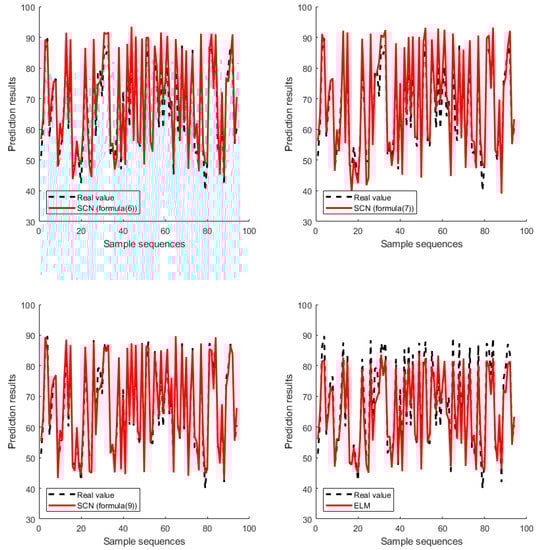 In the past few decades, the gradient-based learning method has been widely used in training neural networks, such as the backpropagation (BP) algorithm, which uses the back propagation of error to adjust the weight of the network. However, due to the improper learning step size, the convergence speed of the algorithm is very slow, and it is easy to produce a local minimum value. So, a lot of iterations are often needed to get more satisfactory accuracy. These problems have become the main bottleneck restricting its development in the application field. Therefore, improving the learning ability and generalization performance of neural network models is a challenging task. One solution is to find an appropriate architecture for the neural network model. Artificial neural networks have two important hyper-parameters, which are used to control the scale of the network: the number of layers and the number of nodes in each hidden layer. The values of these parameters must be specifically determined when configuring the network. However, there is no rule to determine the scale of the network. In the regression prediction application, most researchers set up a series of models with different scales during the training process, and then selected the best one according to the test results [,,]. However, this kind of method increases the training cost and time. Thus, how to determine the ideal number of hidden layer nodes before network training is an urgent problem to be solved [,]. In order to solve this problem, a newly developed randomized learner model, termed stochastic configuration networks (SCNs), was proposed by Wang et al. []. As a single-layer feedforward neural network, the SCN belongs to the random neural network class. Although the parameters of the SCN are also randomly generated, it is different from the existing randomized learning algorithms for single layer feed-forward neural networks (SLFNNs); the SCN mainly randomly assigns the input weights and biases of hidden nodes in the light of a supervisory mechanism, and the output weights are analytically evaluated in either a constructive or selective manner. Compared to other random neural networks, this random learning model is also different from the classical random vector functional link (RVFL) network. The SCN restricts the assignment of input weights and bias by introducing inequality constraints. Under the supervisory mechanism, SCN has a universal approximation property with the increase of the number of hidden nodes [,,,]. Instead of training a model with a fixed architecture, the construction process of the SCN starts with a small sized network and then adds hidden nodes incrementally until an acceptable tolerance is achieved, then solves a global least squares problem with the current learner model to find the output weights. Its advantages ar: the minimization of a convex cost that avoids the presence of local minima, good generalization performance, and a notable representation ability []. Compared with deep neural networks, the SCN has lower training complexity and faster learning speed.