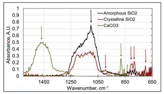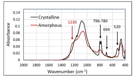 An important use-case for an occupational exposure assessment is the discrimination between crystalline and amorphous silica. The major difference between these two types of silica is found in the peaks at 796–780, 694, and 520 cm−1 in the crystalline silica samples. In addition, there is the broadening of the shoulder at 1230 cm−1 in amorphous silica. The spectra showing the characteristic features of both components are shown in Figure 2.
