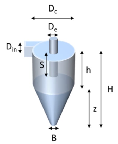 The design of the cyclone is shown in Figure 4 and was based on the design of Kenny et al. [17,18]. According to these studies, an empirical model was developed, predicting the cyclone cut point as a function of body diameter and flow rate. The experimental data were fitted with models of the following form: