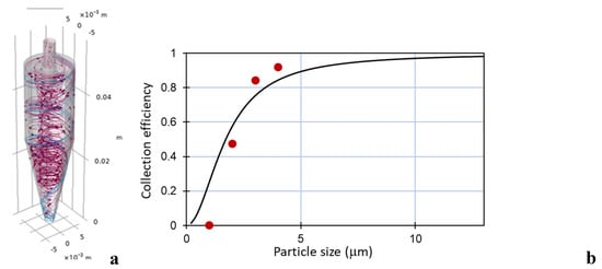 Particle traces inside the cyclone (a) and the calculated collection efficiency for the numerical model (dots) and Equation (1) (solid line) (b).