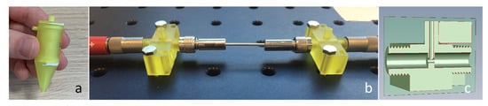 Once the particles have been collected in the cyclone, they will be transported to the hollow waveguide by a very small flow of 1–5 mL/min. The hollow waveguide (HWG) is coupled to the FTIR by using two polycrystalline infrared lead fibers of 860 µm in diameter and 1 m in length. The fibers are connected to the waveguide by means of a SMA coupling. Between the hollow waveguide and the fibers, a connector was positioned, also made by means of 3D printing. This connector enables a close connection between the waveguide and fiber, and it allows air (including particles) to enter the hollow waveguide (Figure 6b,c). The gap between the waveguide and fiber should be as small as possible (i.e., <1 mm) to reduce optical losses.