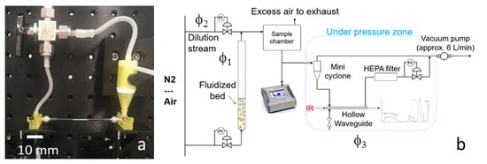 Figure 7b shows the PM exposure setup, including a fluidized bed to generate the airborne PM and a dilution chamber to regulate the concentration of the PM. Three flows can be controlled independently: φ1 through the fluidized bed, φ2 through the sample chamber and into the cyclone, and φ3 through the HWG. The TSI Optical Particle Sizer is connected to the sample chamber to measure the concentration and particle distribution. A HEPA particle filter is added to prevent particles from entering the vacuum pump. The humidity in the air was low (<30% RH), since nitrogen or compressed air was used as carrier gas.