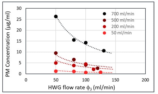A plot of the particle concentration in the HWG (c3) versus the HWG flow rate (φ3) yields Figure 9 for four different flow rates of the fluidized bed (φ1). This plot was obtained by collecting all particles passing through the HWG in a filter and weighing the filter afterwards. At higher flowrates through the fluidized bed (φ1), the PM concentration in the HWG (c3) is also higher. However, for each flow rate through the fluidized bed, the product Ψ1 = φ3xc3 should be constant. The lines with the constant Ψ1 are shown in the figure as dashed curves. The measured points follow these dashed lines nicely.