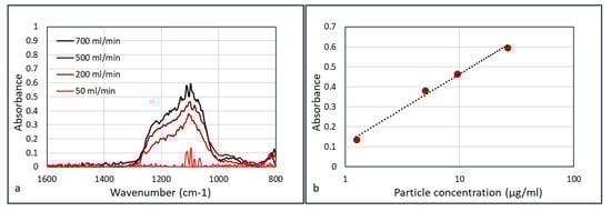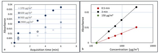 If, besides the chemistry, the concentration of particles also needs to be measured, a time dependent signal is not useful. To assess the possibilities of the FTIR approach, the height of the absorbances of all experiments and concentrations was plotted versus time. This is shown in Figure 13a. The absorbances of all three concentrations gradually increase with time. When the absorbance was measured at a preselected time (e.g., 30 s or 3 min) and the plotted versus the concentration on a logarithmic scale, Figure 13b is obtained. Both graphs converge to absorbance 0 at around 140 µg/m3, which is almost equal to the first measurement at 150 µg/m3, which did not show a measurable absorbance (green dot in Figure 13b).