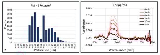 Particle size distribution (a) and time dependent FTIR absorption (Arcoptix) (b) of calcium carbonate at 370 µg/m3.