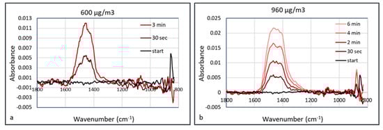 Time dependent FTIR absorption (Arcoptix) of calcium carbonate at 600 µg/m3 (a) and 960 µg/m3 (b).