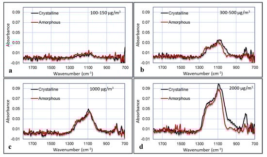 FTIR spectra (with the Agilent) of crystalline versus amorphous silica for four different concentrations in air, using 2 min of data acquisition: 100–150 µg/m3 (a); 300–500 µg/m3 (b); 1000 µg/m3 (c); 2000 µg/m3 (d).