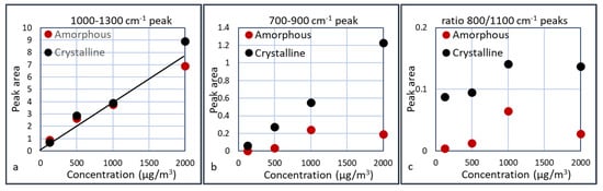 These graphs show that the IR absorbance is directly correlated to the particle concentration. Furthermore, the peak that is characteristic for crystalline silica at 800 cm−1 is clearly visible and indeed larger in the crystalline samples than in the amorphous samples, although this is less pronounced in the 1000 µg/m3 experiment. Several plots were made in which the area of the peaks are plotted versus the particle concentrations. These areas are calculated as the area below the curves between 1000–1300 cm−1 and between 700–900 cm−1. The results are shown in Figure 15.