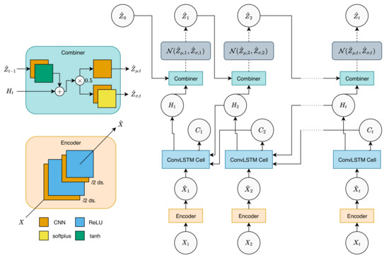 The CNNs used here reduce the spatial size by half (), resulting in a total of th reduction. is a ConvLSTM cell [5]. is the combiner function, defined by: