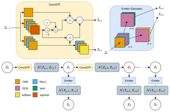 Generative network. Propagation on latent tensors is done by inserting the previous latent to a convolutional gated transition function (ConvGTF) to obtain latent mean and variance, which will then be used to sample the next latent. Observation is produced by inputting the latent into Emitter to output the observation mean and variance, which will be used to sample the observation. “x2 us.” denotes a two-times increase in spatial size (upsampling). Similar to Figure 1, dashed lines denote sampling, while dotted lines denote repetition.