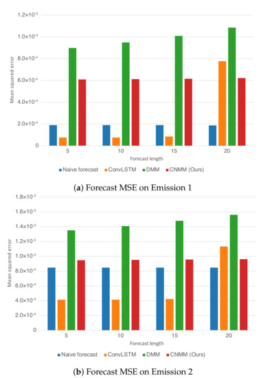 For both experiments, observation mean squared error (MSE) with respect to ground truth is used as the evaluation metric. Instead of calculating the error of the sampled observation, we calculate the mean produced by the Emitter (for ConvLSTM, we use the forecasted observation directly, and in the case of the naive forecast, we took the MSE of the ground truth with the 1-timestep shifted version of it). Here, we evaluate our approach (CNMM), ConvLSTM, vanilla DMM and naive forecast method on the first and second conditions of the heat experiment (Emission 1 and 2, as shown in Equations () and ()) and CMAP data with varying forecasting length (5, 10, 15, and 20 timesteps). When evaluating with the Emission 2 condition, we utilize the models trained on the first emission. This is to evaluate the robustness of the models with respect to noise. To ensure fairness, forecasting for every model uses the one-step forecast method. Furthermore, we run the training procedure five times (except naive forecast, as there are no training required) and present the averaged MSE from every last epoch of the run as the final result. We present the resulting forecast MSE in both table and bar chart forms. The forecast MSE for 2D heat equation data is shown by Table 5 and Figure 4, while the CMAP data is shown by Table 6 and Figure 5. Note that the MSE is calculated on normalized data instead of unnormalized data.