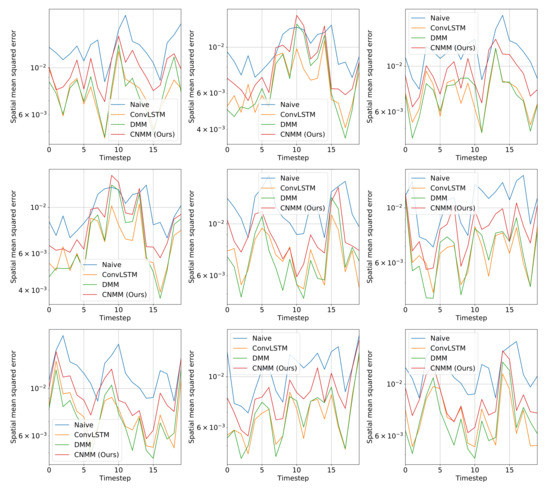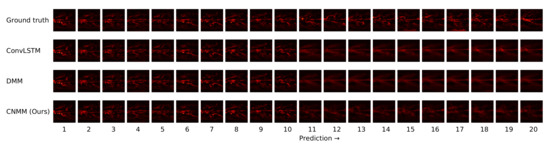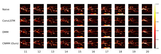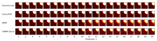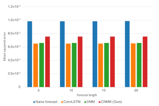 - The combination of 2D CNNs, ConvLSTM, and DMM in the proposed approach opens up the possibility of combining popular 2D CNN-based methods, further increasing DMM’s modeling capability to cater to various spatiotemporal forecasting problems. Conversely, the proposed approach also allows the usage of DMM in other fields, such as video prediction and generation, due to its autoencoder-like structure.