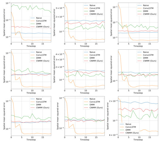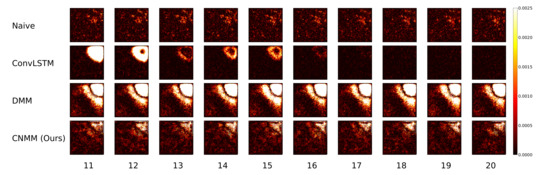 Ultimately, however, for shorter prediction lengths, ConvLSTM yields better predictions. Looking at the result shown by Figure 6, it is indicated that ConvLSTM yields a very low error of prediction after a few timesteps, compared to DMM, our model, and even naive forecast. This shows that ConvLSTM, in general, has a superior modeling ability compared to variational and naive methods. Even though the ConvLSTM initially outputted huge error, it quickly returns to a more stable forecasting error along with time. The reason this can happen is that the ConvLSTM prediction result is smoother than that of ours and the DMM because of its nonstochastic nature, as can be seen in the heatmap visualization given by Figure 10.