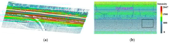 The test dataset shown in Figure 1a was collected using the SSW-IV vehicle laser modeling and measurement system, including an approximately 220 m long highway with numerous cracks. A 2D scanner with a 360° field of view (FOV) was assembled at the rear of an SUV roof 2.2 m above the road surface and oriented perpendicular to the moving direction. The 2D scanning plane was set at an angle of 45 degrees inclined from the horizontal plane. The scanner provided 500,000 measurements and 200 scan lines per second, featuring a detection range of up to 300 m. The concrete road surface was measured at a speed of 30 km/h, resulting in the spacing between adjacent scan lines of approximately 4 cm and distance between adjacent laser points of 0.7–3 cm in the road. Figure 1b shows the common phenomenon of divergent point intensity in two lanes. The point intensities of the lane on the other side were so low (black box shown in Figure 1b) that some cracks were difficult to distinguish with a fixed intensity threshold. In addition, the road surface contained road markings, ruts, stains, black spots, and other intensity-altering factors, which would have an unfavorable effect on algorithms that are based on a global intensity threshold. This situation indicates that the use of point intensity differences and altitude changes to the background may be more effective than a fixed intensity threshold alone.