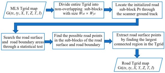 Various algorithms have been developed to extract roads from MLS point clouds. The advantage of using the Tgrid is that the road boundaries can be defined as a continuous curve. Figure 5a shows the cross-section of the studied road with natural slopes on both sides. To identify road surface points quickly, we used the method in Reference [], which roughly approximated the local road patch as a 3D best-fitting plane. Next, this method took the trajectory data as the initial road seed to search the road boundary area along and perpendicular to the scan line using a statistical hypothesis testing method based on the point altitudes. Figure 6 shows a flow chart of the method of detection of road surface points. First, the entire Tgrid is divided into non-overlapping sub-blocks, the size of which is Wxt × Wyt. The sub-block located by the scanner ground track serves as the initialized searching sub-block, P0 (shown in red in Figure 5b). Next, both the road surface and road boundary areas are searched along xt and yt directions through a statistical hypothesis test based on the point altitudes in the sub-block. Then, the possible road points are extracted from the sub-blocks of the road surface and road boundary and finally, identified by finding the largest connected region in the Tgrid.