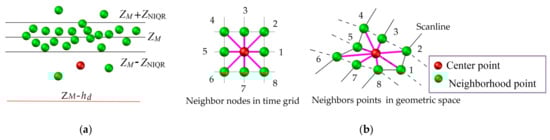 When θ is not available or the MLS data provides a scan angle level with insufficient accuracy, the above method is ineffective. In such a situation, we propose a different approach of constructing Tgrid based on T. In our previous study [], we deduced that the time series of the scanner ground track, i.e., the laser points that the scanner projects directly below, should be in accordance with an isochromatic sequence. As shown in Figure 4b, let TG be the time series of the scanner ground track, TG = {TG1, TG2, TG3, …, TGm+1}, and TGi+1 − TGi = Δt, where Δt is the elapsed time on each scan line. The time range [TGi − Δt/2, TGi + Δt/2] divides the laser points to the ith scanning line. The j indexes of points on ith scanning line can be derived as , where ΔT denotes the emission time interval of the laser beams. If ∆T is unknown, it can be estimated using the time difference (Ti+1 − Ti) between the adjacent laser points. Note that (Ti+1 − Ti) may change over time. We use the symbol ⌊ ⌋ to reduce the estimation error (for more detail, please refer to Reference []). In the Tgrid, each point (i, j) has a maximum of four side neighbors: (I − 1, j), (i + 1, j), (i, j − 1), and (i, j + 1), and four diagonal neighbors: (i − 1, j − 1), (i + 1, j − 1), (i − 1, j + 1), and (i + 1, j + 1). The spatial position of these neighbors is free. In addition, eight neighbors may not always exist. When there are no laser beam returns and no neighbors, they are shown as empty nodes (as shown in (i − 1, j − 1) in Figure 2b).