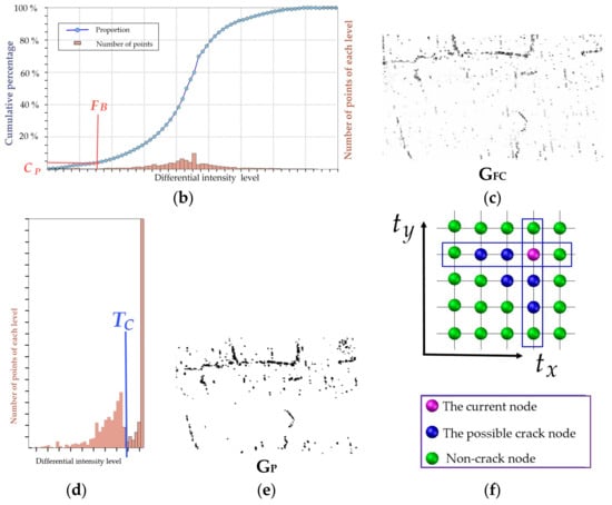 We first generated the background map, GB, using a median filter from the input intensity Tgrid map, GI, which derives from the grid index (i, j) and its intensity. Next, the background-differential map, GF, is obtained using a minus operation as follows: GF = GI − GB. In Figure 8b, the proportion limitation of the crack points (CP) is given and the relevant truncation value, FB, is calculated on the histogram of GF. The differential truncation map, GFC, is generated in Figure 8c by transforming the value of GF(i,j) that is higher than FB to FB. The maximum entropy method is then adopted to determine the segment threshold, TC, of the possible crack points (recorded in GP) and non-crack points. Finally, GP is filtered through the valley effect to remove the nearest non-crack point on both sides of the GP point along the tx and ty directions to compare their altitude. As shown in Figure 8f, two rectangles frame the crack points in the directions of tx and ty respectively, with non-crack points intercepted at two ends when centered on a candidate. If the altitude of the candidate is no greater than the largest of the four non-crack neighbors, the candidate is reserved; otherwise, it is filtered out. The remaining crack candidates are saved to the binary map, GC.
