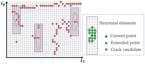 Morphological image processing techniques are often used to connect crack fragments into crack curves and for complicated crack shapes in image-based methods [,]. Unlike the geometric grid, the Euclidean distance of the adjacent points on the Tgrid is constantly changing. The size of structural elements of the closing algorithm is not fixed but is defined by a geometric dimension. As shown in Figure 9, we set a double-layer search structure, the first layer of which is a rectangle with a fixed size, and the second layer of which is a preset geometric search circle with the radius D2. Given that the width and the height of the rectangle are RW and RH, they can be determined by the distance between the densest point cloud under the vehicle in the direction of xt and yt. We assumed these to be dx and dy, respectively. Thus, RW = 2 × + 1, RH = 2 × + 1. The points within the second layer form the structural elements of the morphology algorithm. Note that some empty nodes without geometric coordinates may be expanded during this process. To mark the connected regions of the cracks using the 8-connected neighborhood, the 3D coordinates of the expanded empty nodes are linearly interpolated using the closest existing neighbors at both sides along the ty direction.