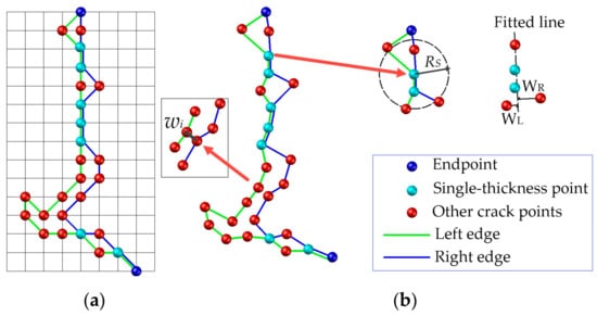 - The edge points shared by the left and right borders are searched and marked as single-point-thickness edge points. In the above method, wi = max (wiL, wiR) is adopted to calculate the related crack width (Figure 11b), while other edge points use Equation (8).
