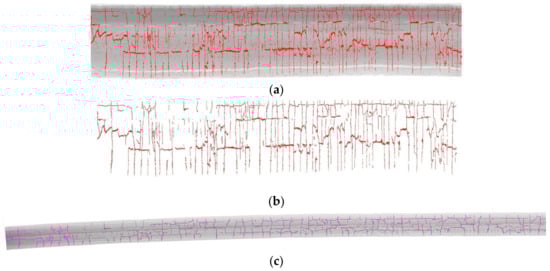 Figure 13a shows the extracted crack candidates, which contain significant noise. Figure 13b expresses the remaining crack points after morphological filtering and Figure 13c overlies the crack curves to the road surface. To enhance the display effect, the crack points are magnified in Figure 11.