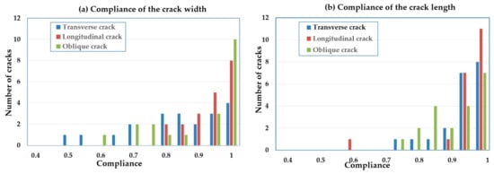 The width compliance of the transverse cracks was relatively scattered and that of the longitudinal cracks was the most concentrated. For the length compliance, the oblique cracks were dispersed and the other two were relatively centralized. Table 3 shows the quantitative results of the 60 samples after averaging the compliance. The variance of the width /length compliance illustrates the above trends. Specifically, an incomplete detection of a longitudinal crack, as an abnormal case, increased the variance of this type.