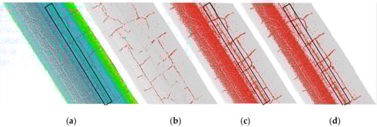 It is evident that using Otsu’s threshold or the maximum entropy threshold extracted over-sized crack candidates. Although they are excellent methods for automatically determining the global threshold, they cannot adaptively adjust to the extraction of cracks with very small proportions in large-scale data ranges. Moreover, the proposed background difference algorithm improves the negative effects of inconsistent intensity due to road roughness, road markings, different pavement materials, etc. In addition, the ruts expressed as raised ridges are not distinguished by low intensities (the black box in Figure 15a,c,d). This study embeds the analysis of the altitude changes near the crack points: the ridged ruts have been removed and the robustness of the method has improved. When compared with the aforementioned threshold-segmentation methods, the proposed method is advantageous in its adaption to more complex environments and global applicability; thus, it effectively segments cracks from large-scale MLS point clouds.