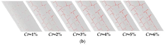 Although valuable (but not universal), interference-related noise caused by road markings, etc., that accounted for a larger proportion of the point cloud than cracks, is greatly reduced after setting CP (not exceeding 10%). It is also evident that when CP exceeds 4% (Figure 16b), the extracted crack curve is almost complete. As CP continues to increase, the noise increases. It is preferable to infer that the real proportion of cracks of the test data was approximately 4%. The results show that presetting the crack ratio is effective for eliminating interference.