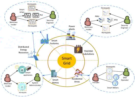 Depiction of various threats and possible honeypot deployments in smart grids.