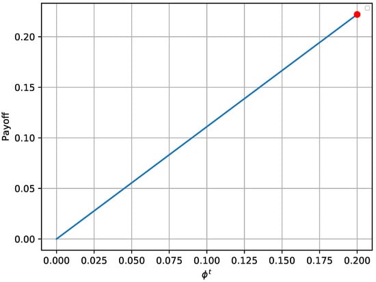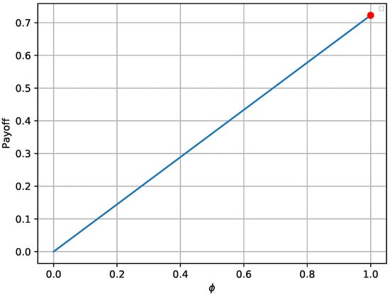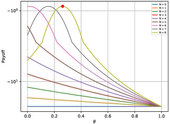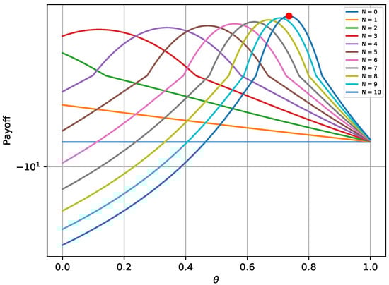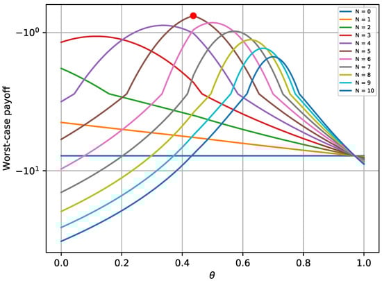 Figure 4 depicts the maximum worst-case payoff that corresponds to the solution received by Equation (27). This solution is compared to the worst-case payoffs that are received for different values of . The results prove that the defender successfully chooses the best possible strategy that yields the maximum payoff, assuming that the attacker always chooses the best strategy. Similar trends for various values of N are noticed, as with the first experiment.