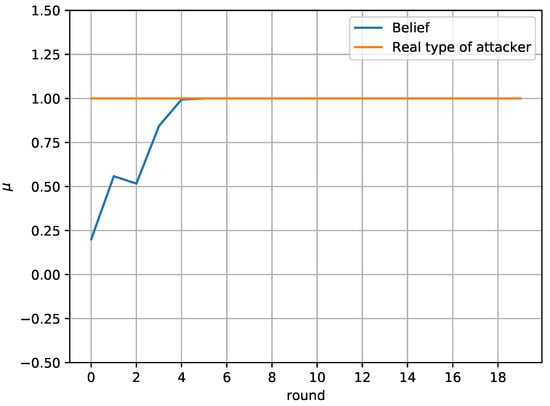 Finally, Figure 7 and Figure 8 study the defender’s belief about the actual type of the attacker. In particular, Figure 7 compares the belief of the defender about the attacker’s type with the actual type of the attacker. It is assumed that 1 represents type a and 0 represents type b. It is shown that the defender successfully identifies the attacker’s type in round 4 and does not change their belief, as the attacker’s behavior remains the same throughout the game