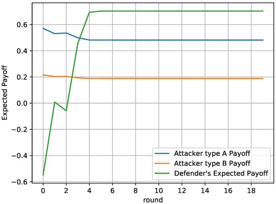 Figure 8 depicts the players’ payoff through time. It is evident that the defender’s payoff increases as they approach the actual type of the attacker. The defender’s payoff exceeds the payoff of its opponent and gets maximized after round 4, when the defender is confident enough about the real type of the attacker.
