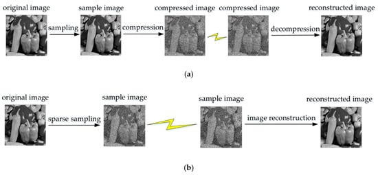 In 2006, Donoho et al. [1,2] proposed the theory of compressed sensing (CS), CS sampling breaks through the limitations of the Nyquist sampling theorem. Random sampling is used to obtain discrete signal samples at a low sampling rate. The traditional signal sampling and compression processes are combined into one, and then the signal is nonlinearly reconstructed by discrete samples; it provides a solution for the data transmission effect of low energy consumption, low storage, low broadband, and high data volume. Compared with traditional sampling and compression techniques, the image acquisition method based on compressed sensing has the advantages of simple coding and good compression performance. The comparison between the two modes is shown in Figure 1.