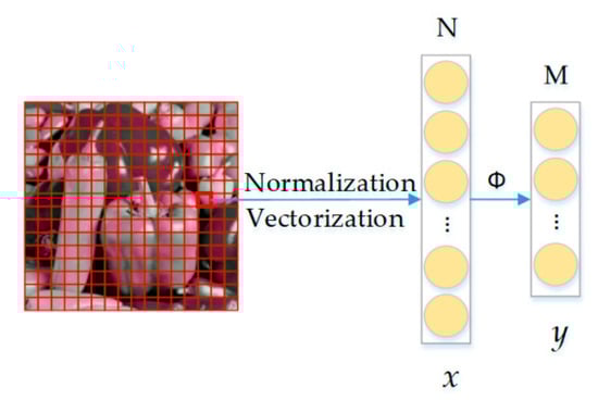 However, since the general natural signal x does not satisfy sparseness, it needs to be sparsely expressed on the sparse basis; let x = Ξ¨s, Ξ¨β RNΓN is the sparse basis matrix, and s is the sparse coefficient. The mathematical expression of compressed sensing is shown in Equation (1), and the schematic diagram is shown in Figure 2.