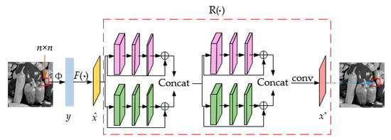 The linear mapping network is recorded as the function F(Β·). According to the analysis described above, with input the original image x to the function F(Β·), we can obtain an initial reconstructed image in order to reduce the error between the two and achieve a better reconstruction effect; multi-feature depth residual reconstruction is performed on , and it is recorded as a function R(Β·). Specific method: first, input into two residual modules of different scales; second, tensor stitching is performed on the output of the two modules, which is recorded as ; then, send to residual modules of different scales and perform tensor stitching; finally, 1 Γ 1 convolution is performed to obtain the final reconstructed image x*. The specific mathematical model is shown in Equation (5). The compressed sensing image reconstruction model based on the multi-feature residual network is shown in Figure 5.
