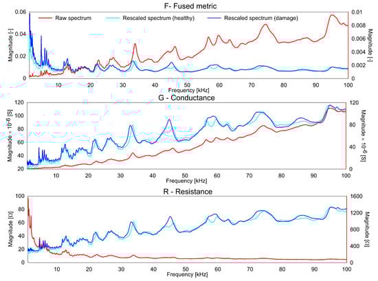 where the symbol n is used for the number of frequency spectrum samples, k is used for k-th state, is the i-th damage state. is the single sample of the spectrum divided by frequency for the single sample of the spectrum divided by frequency for -th damage state. It is known that G and R show a trend with the frequency, so the measurements were rescaled (detrended) by multiplying the values by the normalized frequency for each measurement of R and dividing by the normalized frequency for each measurement of G as shown by the Equation (8). The above operation maintains the units of G, R and F.